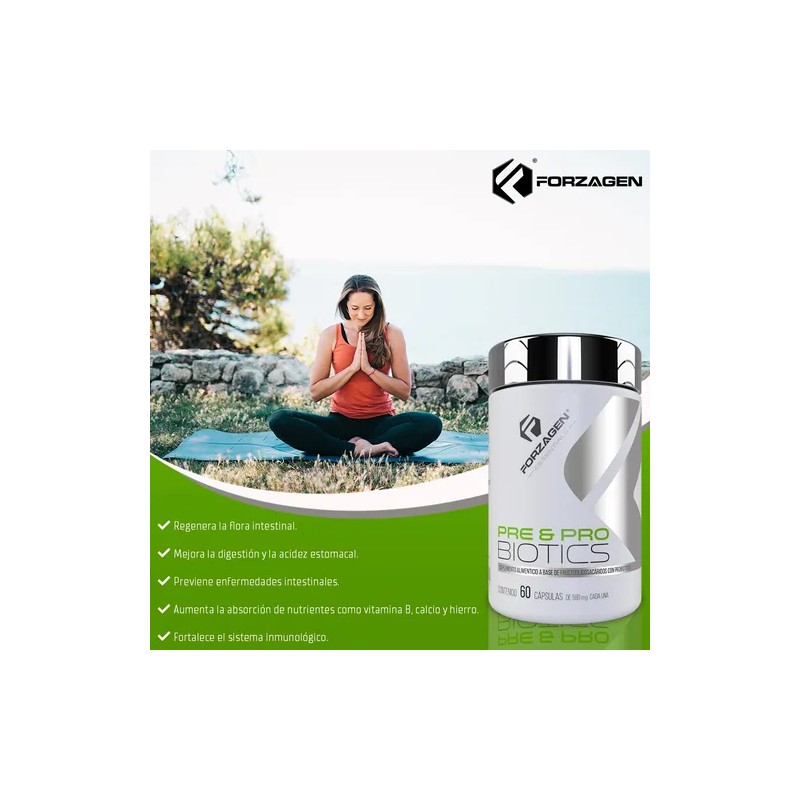 Forzagen Essentials Pre&Probiotics es una fórmula avanzada a base de prebióticos y probióticos diseñada para hombres y mujeres. Contiene 10 billones de lactobacilos vivos por porción, incluyendo fructooligosacáridos e inulina de achicoria, que contribuyen a mantener una flora intestinal saludable y fortalecer el sistema inmunitario.