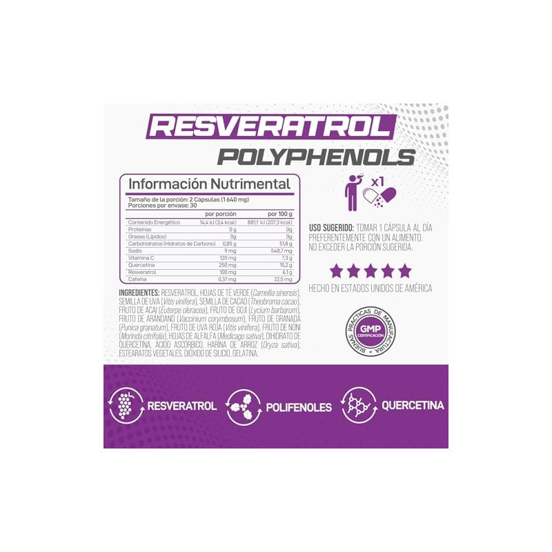 🌟 ⭐ Forzagen | Suplemento Alimenticio Resveratrol+Polyphenols | 100 mg de Resveratrol + 250 mg de Quercetina | 30 Servicios | Con Complejo de Polifenoles | Antioxidantes | Suplemento Natural | 60 Capsulas ⭐ 🌟