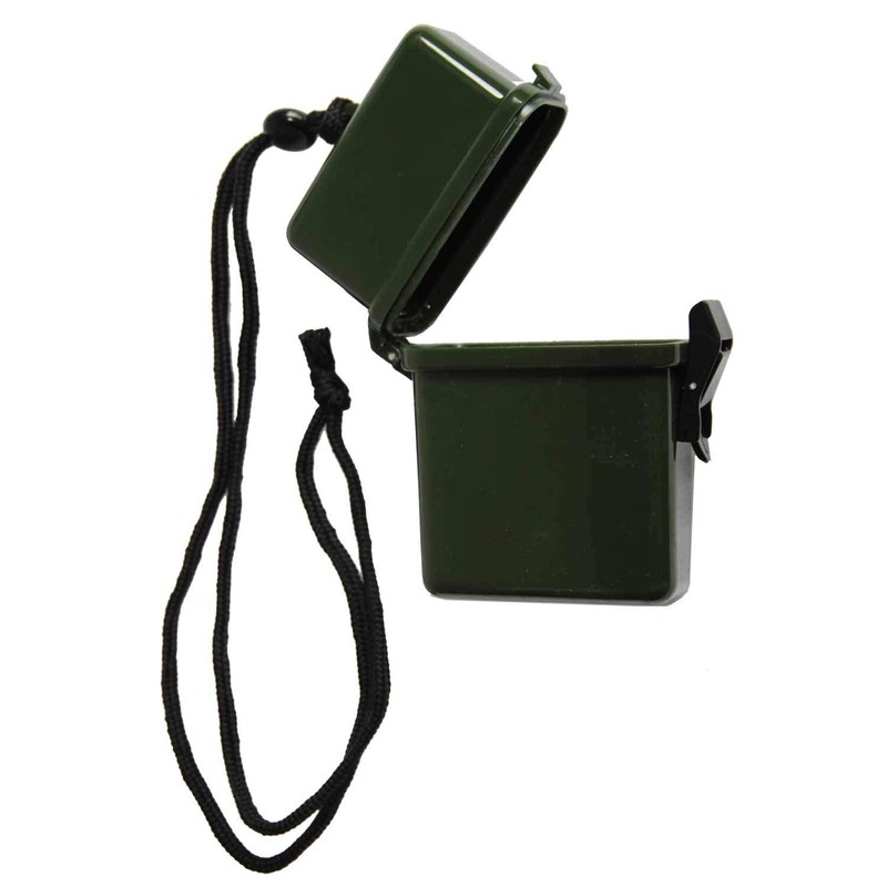 Waterproof box with neck strap, colour: olive. The ideal companion e.g. on holiday on the beach or on a boat trip to store your valuables dry and dry. Colour: olive small and compact with side snap closure with neck or collar. Dimensions: approx. 11 x 8 x 3 cm. Material: 100% plastic. Box contents: 1 (one) waterproof box with neck strap