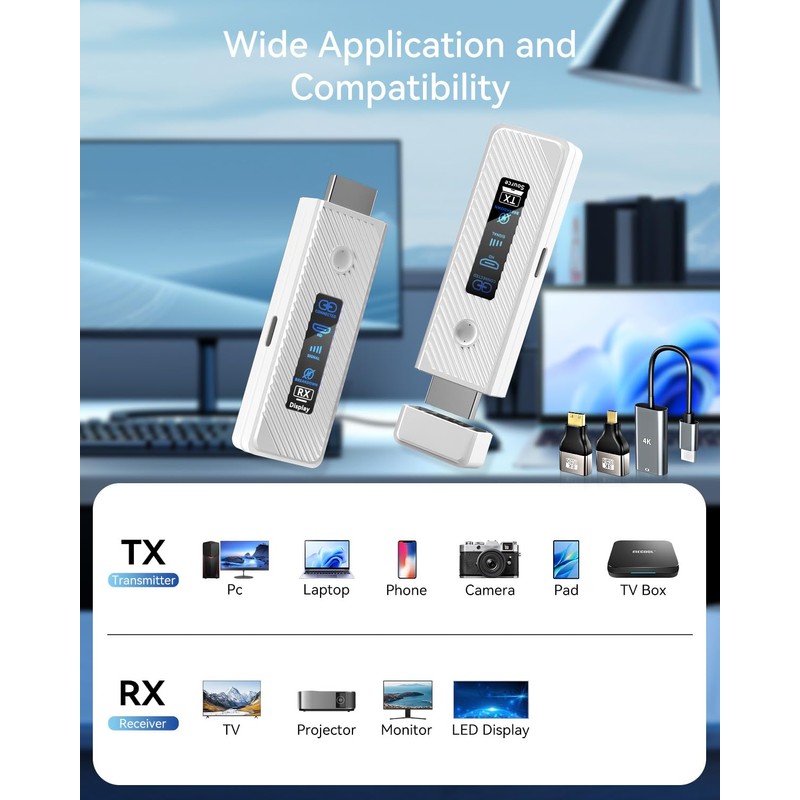 - 【Wide Compatibility, Multiple Usage】The wireless transmitter supports projecting from PC/laptop/cameras/dv/TV box to projector/monitor/HDTV. And have 3 accessories: USB Type-C to HDMI Adapter (Max support 4K )/ Mini HDMI Adapter and Micro Adapter (Max support 4K )