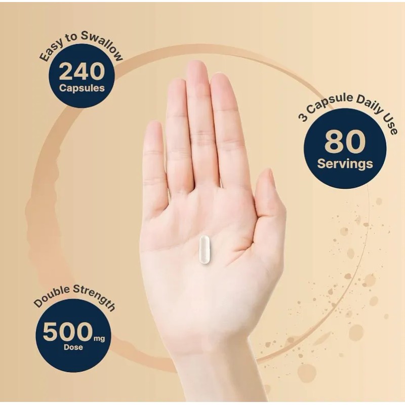 240 cápsulas por botella, tamaño de porción de 3 cápsulas, dosis de 500 mg, hasta un suministro de 80 días.