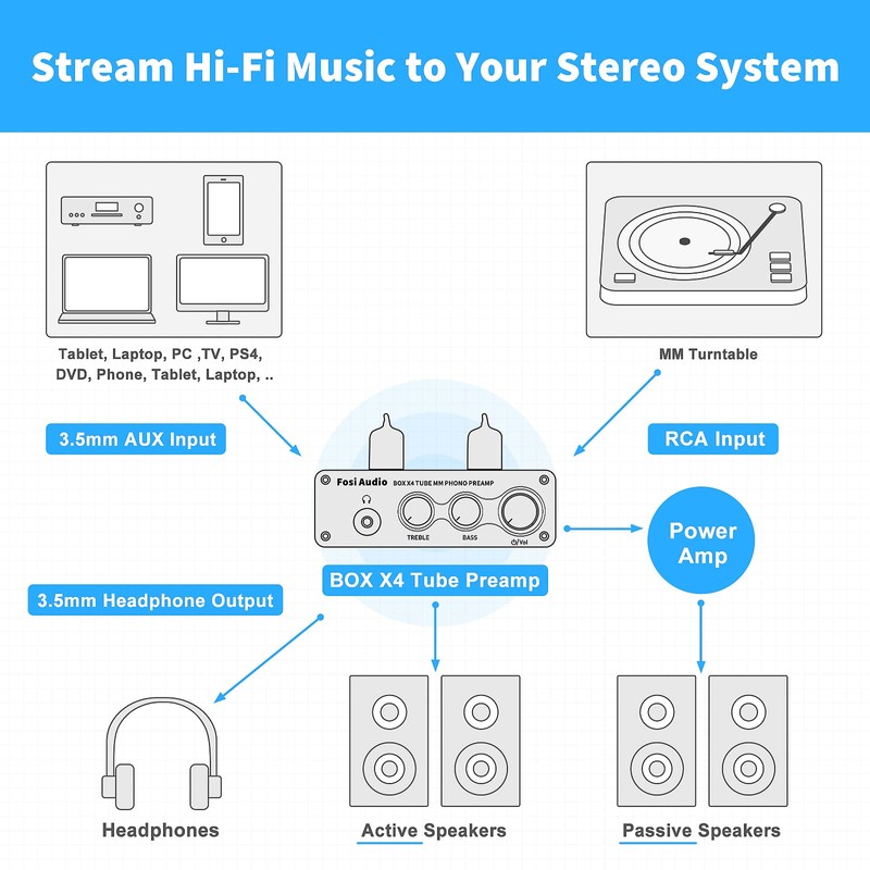 - JAN 5654W Tube MM Phono Preamplifier: The BOX X4 phono preamp supports 3.5MM AUX and MM turntable input, converting phono signals to Line Level with low-frequency noise removal using high-quality components and low-noise integrated circuits. Protect your turntable with the grounding post feature.