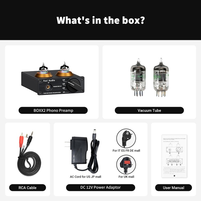 - Package Content: You will get 1 x Box X2 phono preamp, 2 x vacuum tubes, 1 x RCA cable, 1 x power adaptor, and 1 x user manual