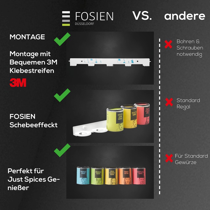 - Assembly without drilling – thanks to a 3M adhesive strip, the just spices spice rack hangs within a few seconds without drilling. In addition, this spice rack also includes screws and dowels.
