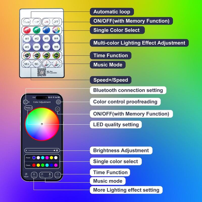 - Triple control: Take control of your addressable COB RGB smart IC LED strip with the app, remote control or control box. With a stable Bluetooth connection, you can turn the strip on and off, change RGB colours and adjust speed, effect length, brightness and scene modes (rainbow/meteor/stars/fire). The memory function of the app controllable COB LED light strip. Remememememyour last Mode settings, convenient for your next use.