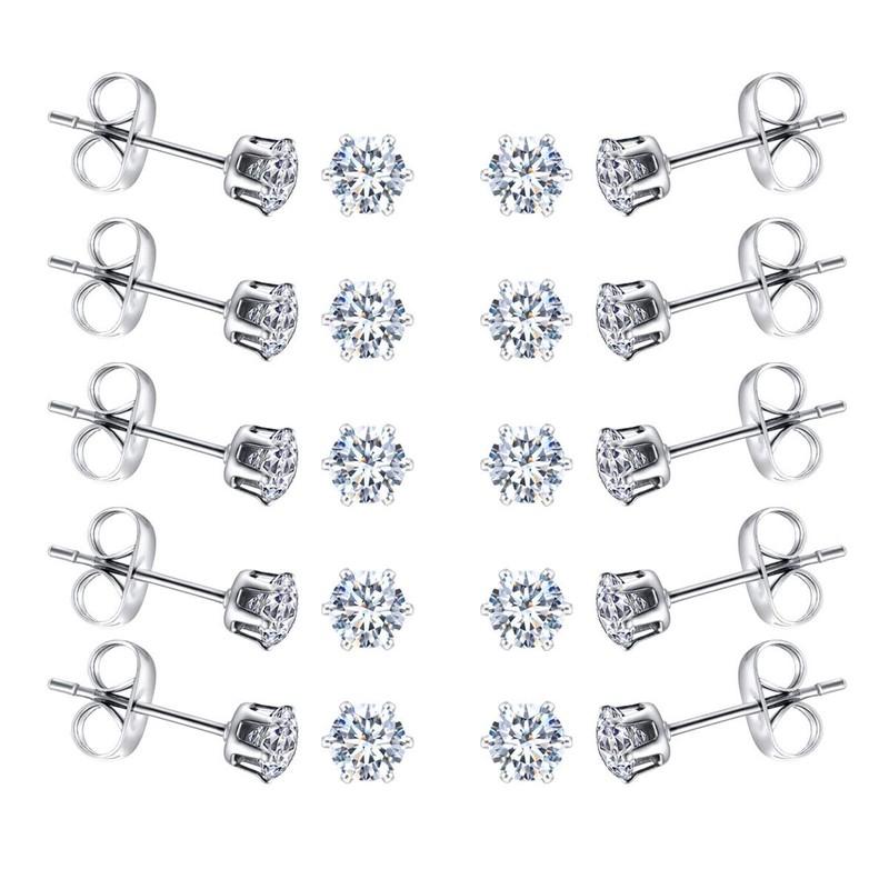 FOSIR 2-4MM Tiny Women's Stainless Steel Round Clear Cubic Zirconia Stud Earrings(10 Pairs)
