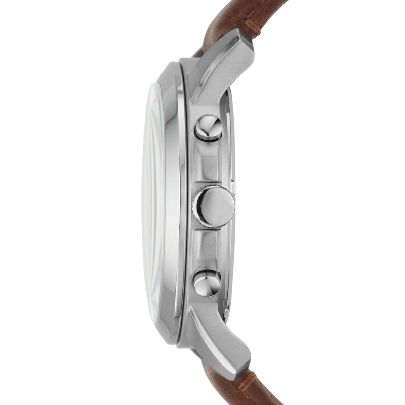 - Caja de acero inoxidable con carátula negra; correa de piel color café oscuro con cierre de hebilla ajustable; intercambiable con todas las correas de reloj Fossil de 22 mm