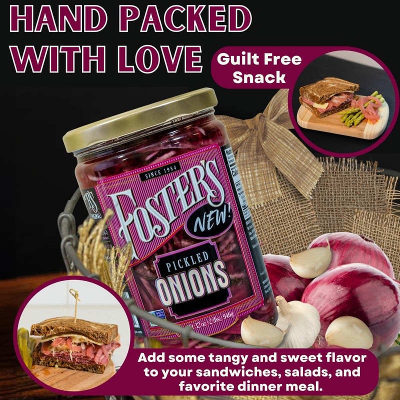 Foster's Pickled Red Onions in a Jar, 32oz, 1 Pack, Traditional Pickled Vegetables Recipe for 40 years, Gluten Free, Fat Free, Preservative Free, Low Calorie Snack, Farm Pickled Onions