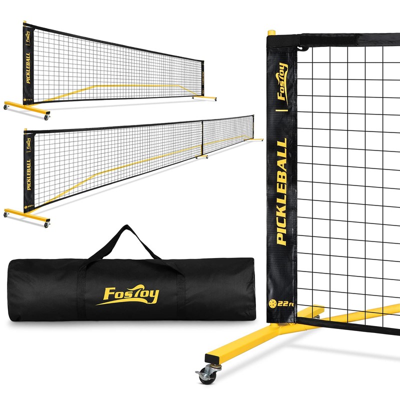 Fostoy Portable Pickleball Net with Wheels, Regulation Size 22 FT & Half Court 11 FT, Steady Metal Frame for Backyards, Driveways, and Garages (Black&Yellow)