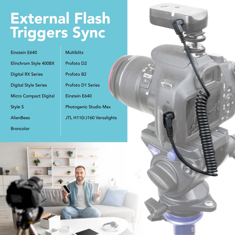 Foto&Tech 3.5mm to male flash PC sync cable has a lot of functions. Not only can you attach the flash to the camera’s sync terminal or socket, you can also attach the flash receiver to the moonlight. It will work on most flashes that take a single pin plug. Professional spring PC sync cable. It can be extended to 54 inch. It has a screw lock so the cable can be locked with the PC socket of the camera.