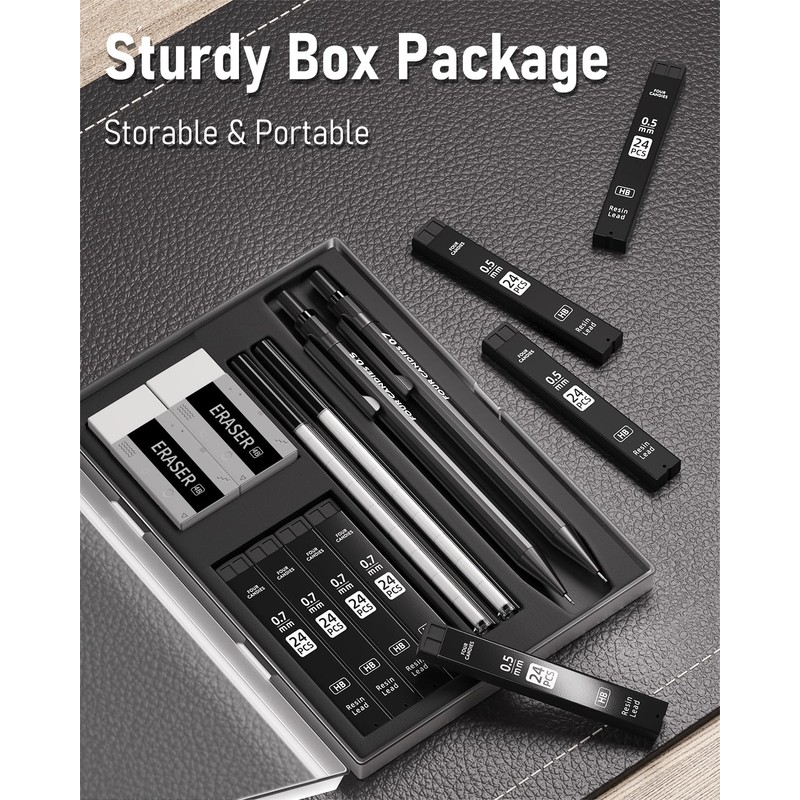 - Exquisite Pencil Set; The mechanical pencil set contains 2 metal pencils (0.5mm and 0.7mm), 8 tubes of HB 2 resin lead (24pcs / tube, 4 tube / model), 2pcs 4B-soft erasers and 18pcs eraser refills all in a storage case