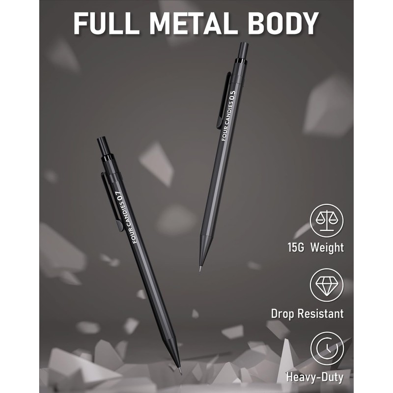 Four Candies Metal Mechanical Pencils 0.5 & 0.7 mm, 2PCS Mechanical Pencils with Dual Spring, 8 Tubes Lead Refills, 2PCS 4B Erasers and 18PCS Eraser Refills, Mechanical Pencil Set for Writing Drawing