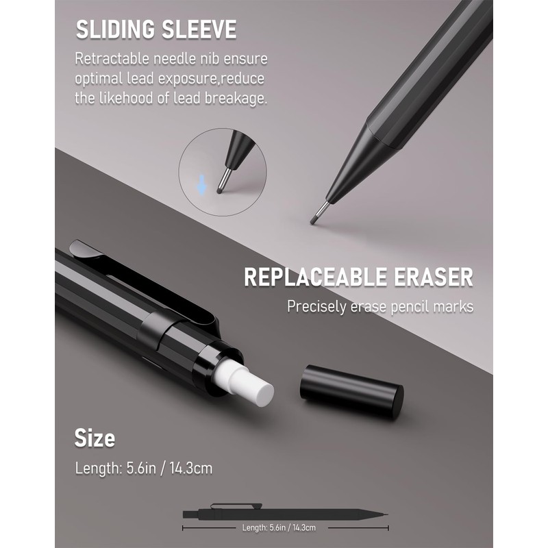 - Non-Slip Comfortable Grip; This mechanical drawing pencil has a metal clip that allows you to clip it to the pocket after drawing. The pencil body adopts a polygonal design with 16 sides. It is easy to hold and fits perfectly between your fingers, gives you a comfortable cool feeling and is non-slip in the hand