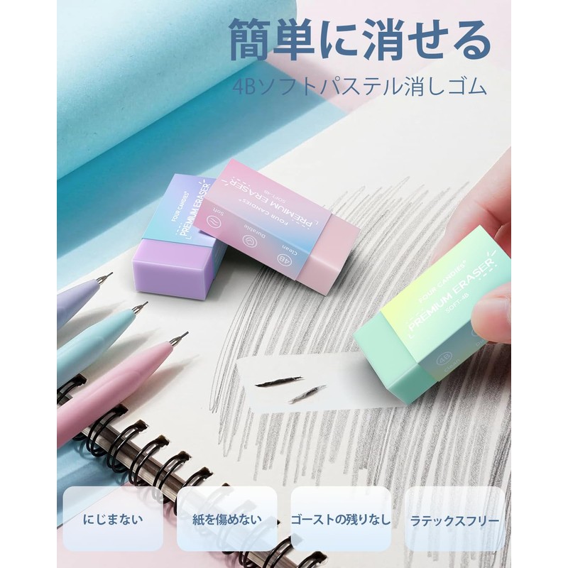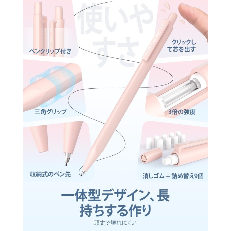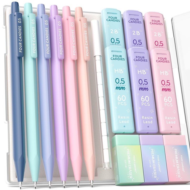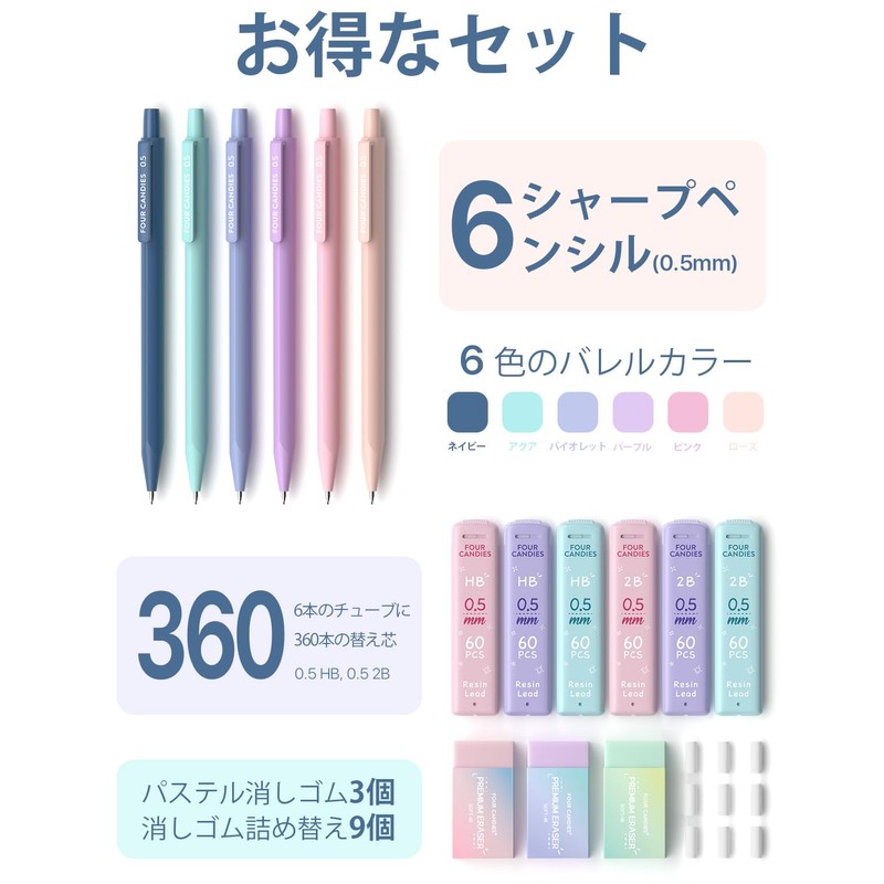 Four Candies Pastel Mechanical Pencils, Set of 6, 0.5mm, HB & 2B, Easy to Write, Middle School Students, 360 Leads with Eraser, Cute, Simple, Girls, Boys, Students, Stationery Set