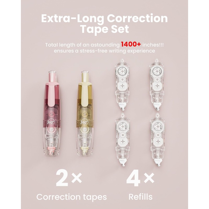 - Extra-Long Correction Tape: Each white out correction tape measures 236 inches, Each set includes 2 white out tape and 4 extra refills, total length of an astounding 1400 + inches!!! Whether you're taking extensive study notes, working on office documents, or creating manuscripts, our correction tape can handle it all with ease.