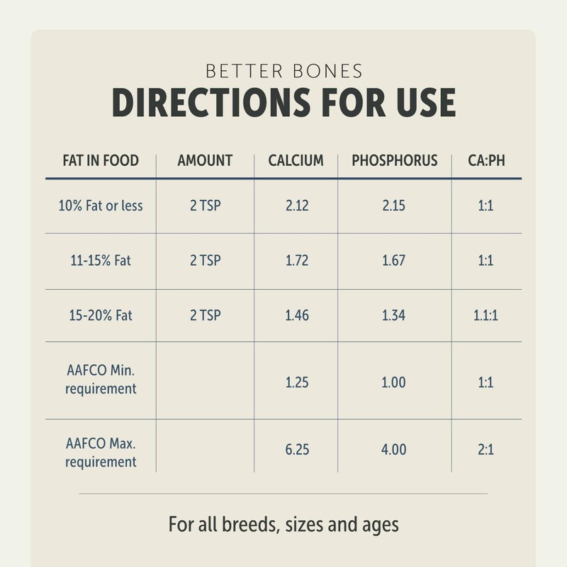 - Suited for Dogs of All Growth Stages: Many dogs struggle to eat whole bones. Better Bones is an excellent calcium powder for dogs suitable for seniors and puppies on a homemade diet. You don't need to worry about choking or splintering, and you don't need to add unnatural calcium to cooked foods. Best of all, it only takes a few seconds to mix the right amount of our air-dried bone powder into your pet's home-prepared meals.