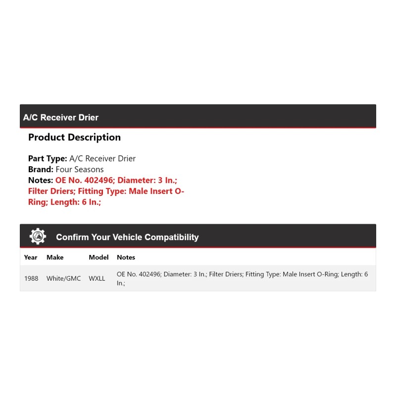 1988 | White/GMC | WXLL | OE No. 402496; Diameter: 3 In.; Filter Driers; Fitting Type: Male Insert O-Ring; Length: 6 In.; |
