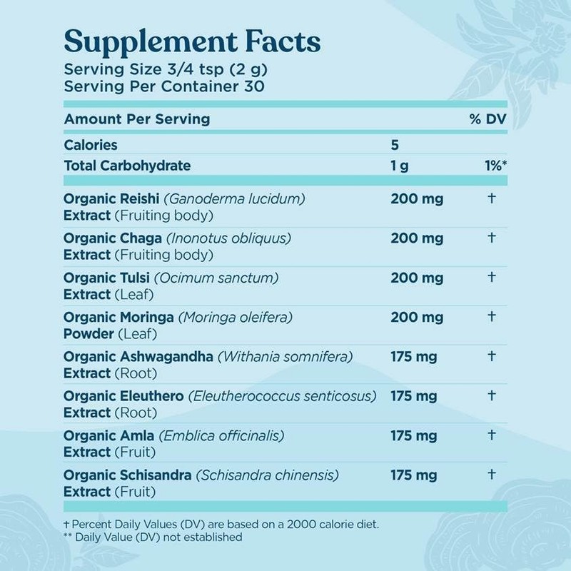 - MUSHROOMS TO MELLOW YOUR MONDAYS Extracted Chaga mushroom powder has been used for centuries for its incredible immune defense properties. Extracted Reishi mushroom powder helps calm the mind and support occasional stress. These two dynamic mushroom extracts are combined in our adaptogen powder blend to provide your body an elegant, calming balance.