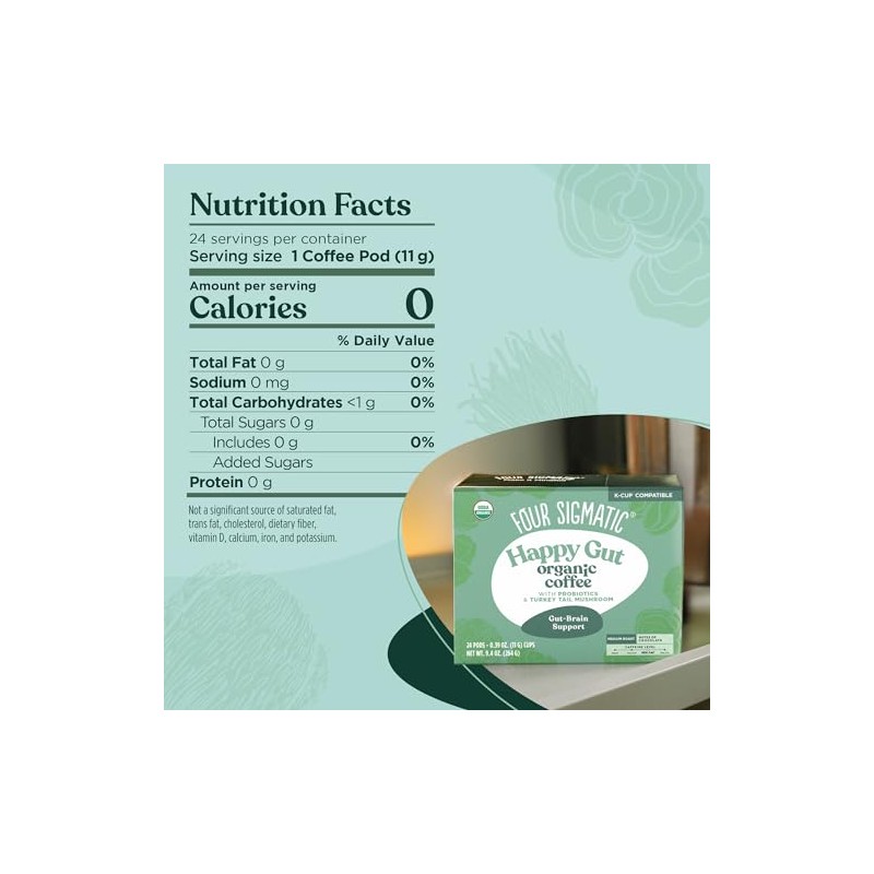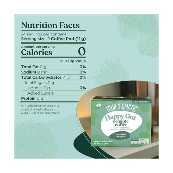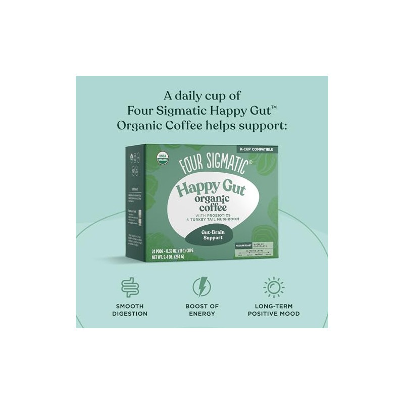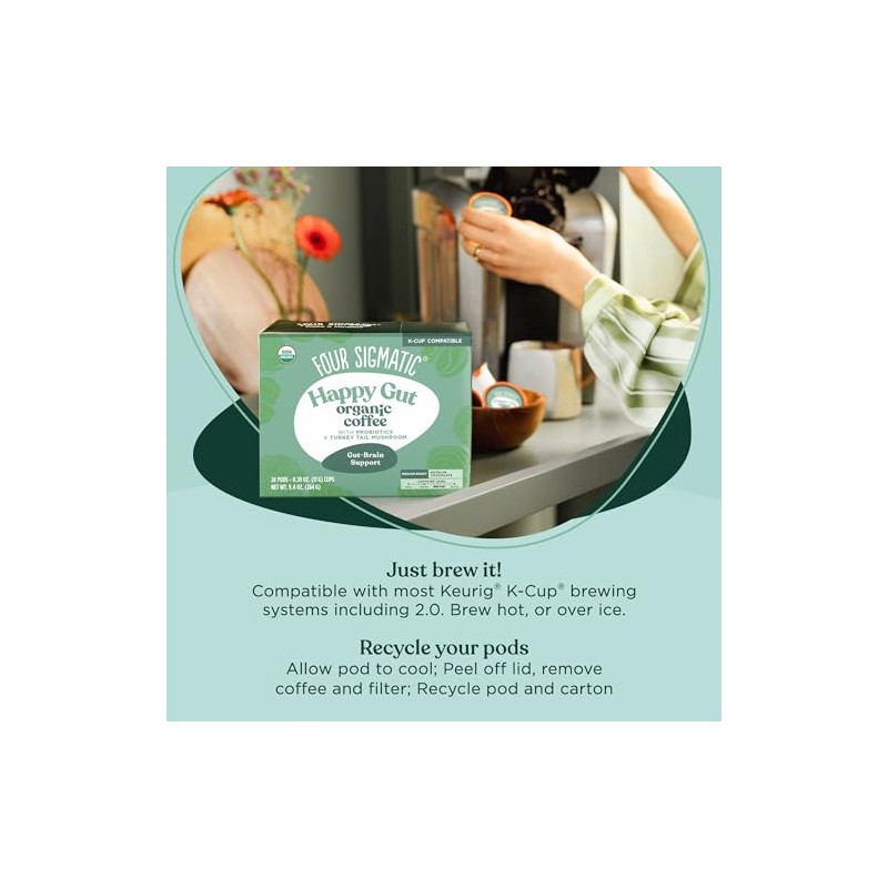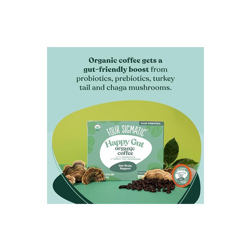 Four Sigmatic Four Sigmatic Happy Gut Organic Coffee Pods | Medium Roast Probiotic K Cups with Chaga and Turkey Tail | Immune Boosting, Probiotic Mushroom Coffee K Cups for Gut Health and Immune Support | 24 Count