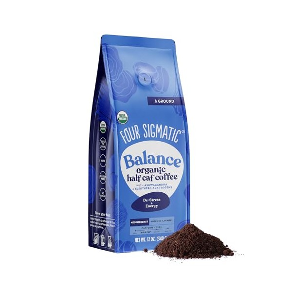 Four Sigmatic Four Sigmatic Organic Balance Adaptogen Ground Coffee | Medium Roast USDA Organic Coffee with Ashwagandha, Chaga Mushroom, Eleuthero and Tulsi for Focus and Energy Boosting | 12oz Bag