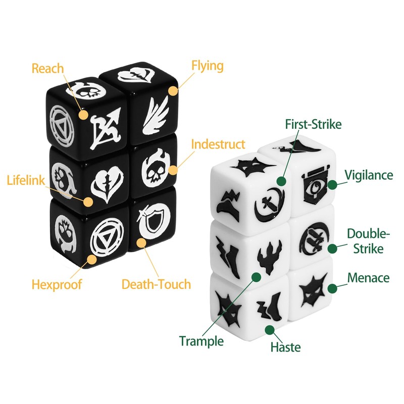 • CLEAR AND INSTANT RECOGNITION: Our pattern dice feature unique symbols representing key abilities like Lifelink, Reach, Flying, and more, so you can quickly and easily track game effects without needing to read tiny text. The clean designs make game play smoother and faster, especially during intense matches.