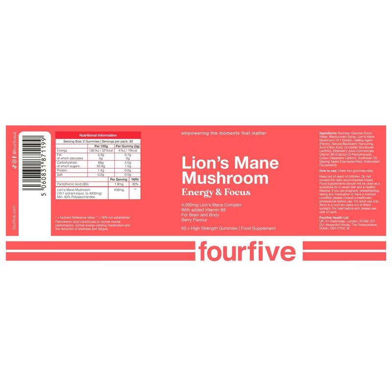 fourfive fourfive Lions Mane Mushroom Gummies (4000mg) Energy & Focus Blend with Vitamin B5, Support Brain Function, Focus & Energy - 60 Gummies