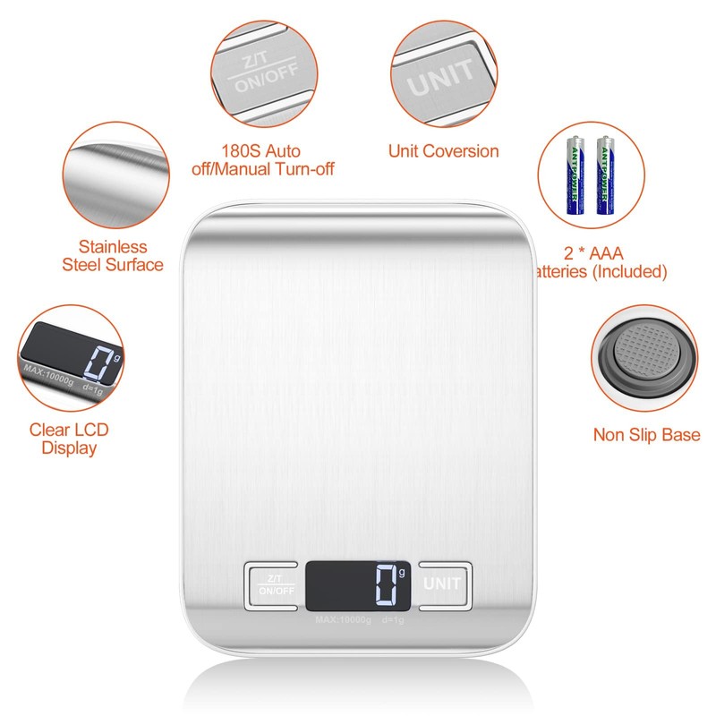 - Unique design: the kitchen scale is small and does not take up space. The surface is made of a flat stainless steel plate (please tear off the blue protective film before use), which is wear-resistant and rust-proof as well as easy to clean. The kitchen scale comes with two AAA batteries