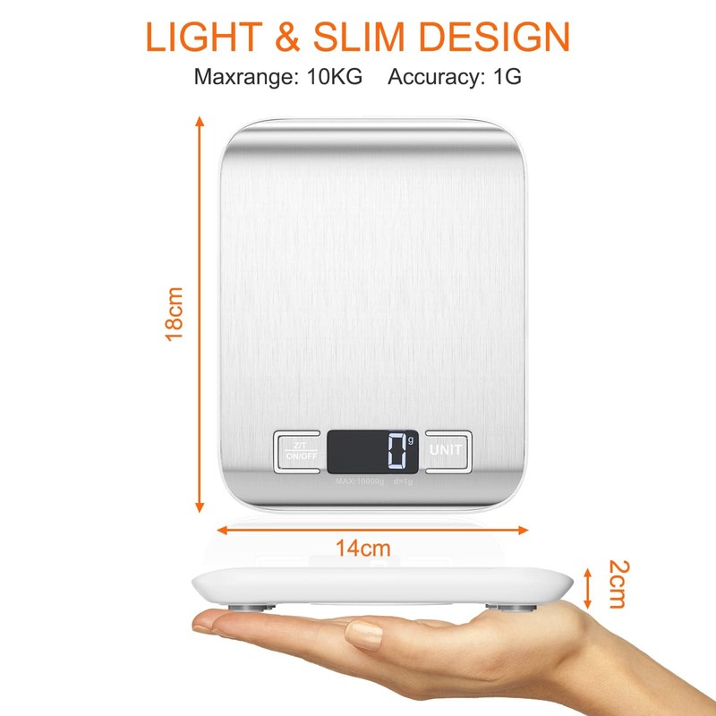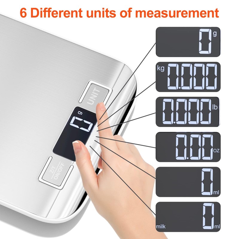 - Multiple units of measurement: The electronic kitchen scale has 6 different weight units: g/kg/lb/oz/ml/milk ml, which can be easily and quickly converted by pressing the convenient to use UNIT button.