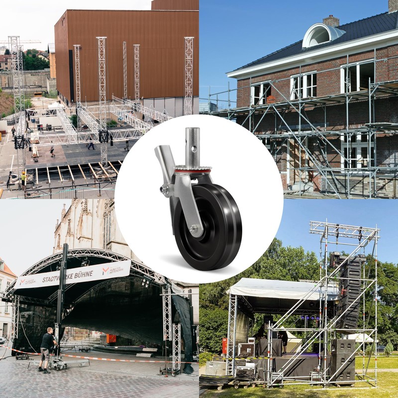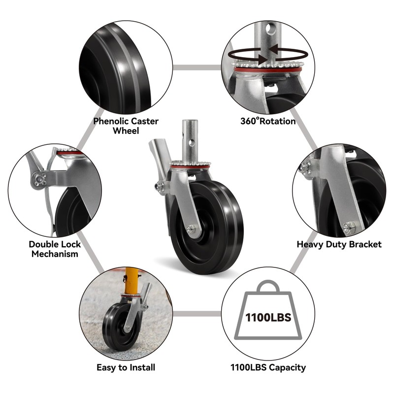 - 【Scaffolding Wheels】: These wheels can bear a lot of weight. Each caster holds up to a maximum of 1100 lbs. or 4400 lbs when purchasing a set of 4 casters. Get so much more longevity out of this Phenolic wheel when comparing it with an industry-standard plastic or hard rubber wheel. With this Phenolic wheel, you will have peace of mind knowing it is one of the most impact-resistant wheels with the highest weight capacity in its class.