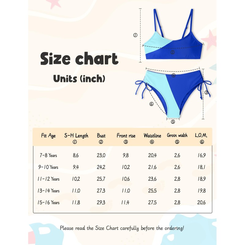 - Package:The girls' swimwear Includes two pieces; You will get one bikini top and one bikini bottoms of teen bathing suits; Please refer to the size chart on the detailed page carefully before ordering
