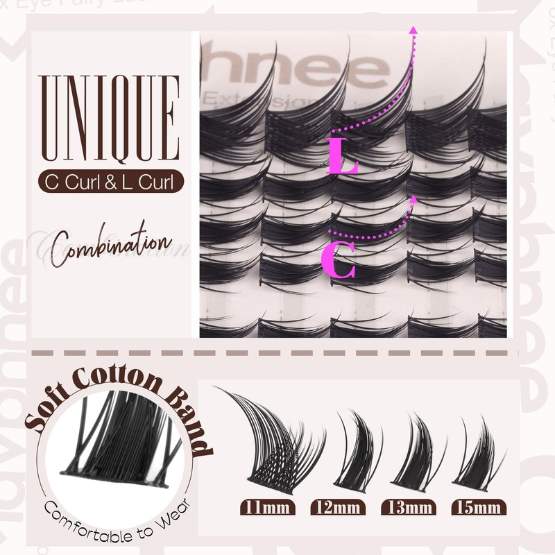 - Unique C Curl and L Curl Combination: This natural cluster lashes pack combines the soft, whimsical charm of C curl fairy individual lashes with the sharp, elongated elegance of L curl fox eye eyelash clusters. The C curl manga lash clusters add volume and a dreamy touch, while the L curl cluster eyelash extensions lift and extend the outer corners, giving your eyes that signature fox eye allure with a hint of manga-inspired playfulness.
