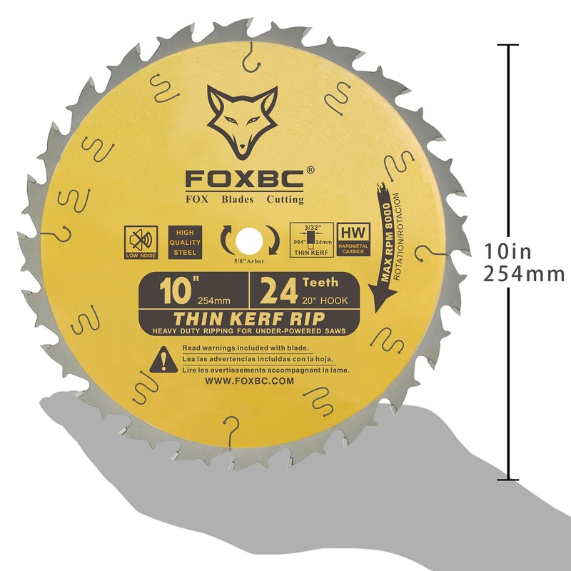 FOXBC 10-Inch Table Saw Blade, Thin Kerf Ripping Saw Blade for Wood Cutting, 24-Teeth, 5/8-Inch Arbor