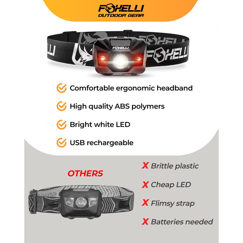 - WATERPROOF & DURABLE: Why to equip yourself with anything but the best and most reliable waterproof headlamp? Foxelli headlamp flashlight is built to last. It will withstand heavy rain, cold, heat, dropping on the ground. Our head flashlight is rated IPX5, which means it is protected against splashing or spraying water from any angle.