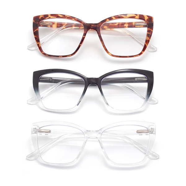 FoxMook 3-Pack Reading Glasses for Women, Oprah Style Frame Spring Hinge Readers Blue Light Blocking Glasses, C2_Black-Clear C3_Tortoise-Clear C4_Transparent 3.0 x