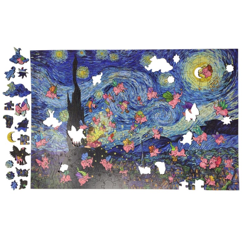 Sophisticated elements, cut with a high-precision laser, seamlessly slide together into colorful art, making it oddly satisfying to put a wooden piece in place. Each puzzle contains dozens of hand-drawn, uniquely shaped pieces, called "whimsies". Whimsies are designed by artists and crafted to match the puzzle's theme and tell a story. The intricately cut wooden puzzle will challenge a puzzler and provide hours of enjoyment.