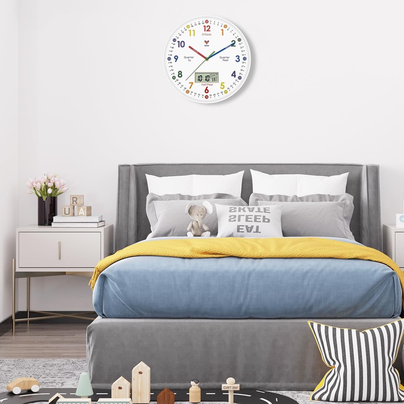 Foxtop Kids Learning Wall Clock Silent Analogue 12 Inch Teaching Clock for Classrooms Children's Room Clocks with Time Week Temperture LCD Display