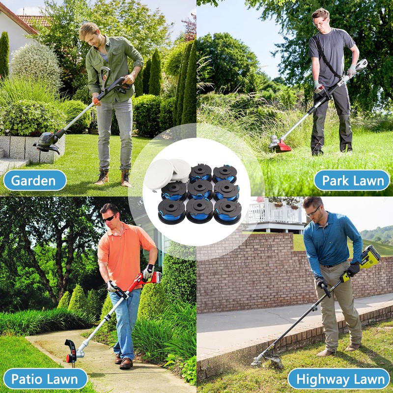 - Bulk pack of 8 spools + 2 caps: you will receive 8 replacement spools (each 11 feet long, 5/8 inch) and 2 matching lids, neatly packed in a sturdy cardboard box.Great as a supply for summer or for anyone who trims professionally or regularly, easily cuts through grass and weeds