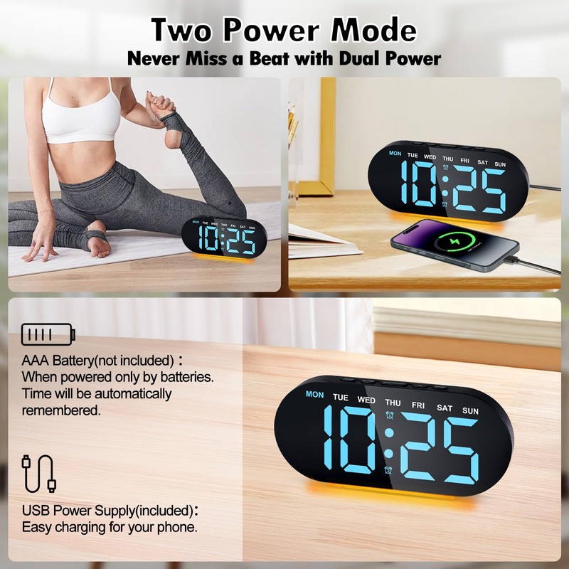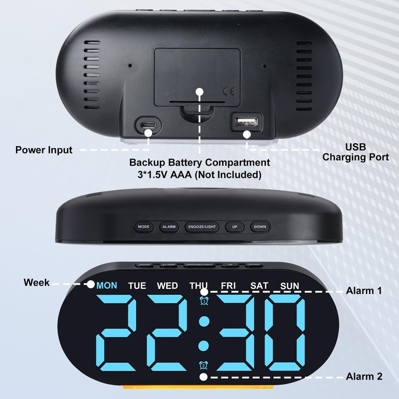 • 【Dual Alarm Clocks】Stop fighting over wake-up times! With independent dual alarms, you and your partner can finally declare a truce. Early-bird catching the 6AM flight? Night owl craving Sunday brunch in bed? ​​Bedroom alarm clocks​​ now play for both teams. Set weekday hustle mode for your 9-to-5 grind, weekend mode for lazy cuddle sessions – or mix-and-match days like a pro. No more compromise, no more chaos.