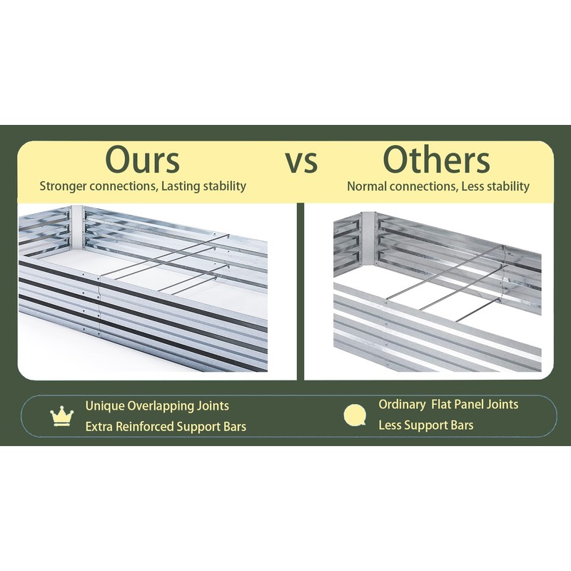 This steel raised bed garden made of stable thickened metal and frame it all construction, open bottom, easy setup, provide ample growing space to raise vegetables, herbs, flowers and plants.SpecificationsProduct Dimension(set up): L x W x H- 5FT x 3FT x 1FT- 6FT x 3FT x 1FT- 8FT x 4FT x 1FTColor: Galvanized, Green, Grey GALVANIZED: Raised garden bed galvanized steel, raised bed garden metal PLANTER BOX: Raised flower bed, raised herb garden planter, raised planter bed garden VEGETABLES: Raised garden beds for vegetables metal, provide ample growing space to raise vegetables, herbs, flowers and plants OPEN BOTTOM: Metal raised beds for gardening with open bottom, provide good drainage, keep weeds away from soil, defense against pests, and protect your plants and vegetables.