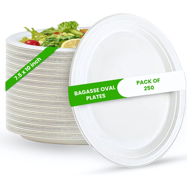 FPN Oval Plates Disposable (250, Small) Sugarcane Eco-Friendly – Biodegradable, Compostable, Sturdy, BPA-Free, Microwave & Freezer Safe – Perfect for Parties, Weddings, Picnics & Everyday Use