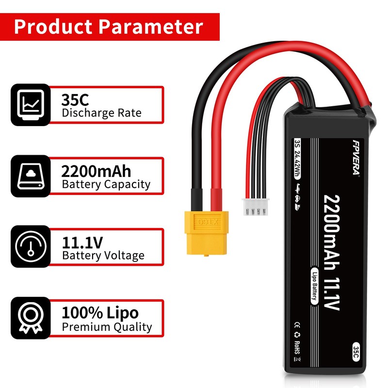 - 3S 2200mAh Battery Parameter - Material: Lithium polymer, Voltage: 11.1V, Cell:3S, Capacity:2200mAh, Discharge:35C, Charging plug:JST-XHR-4P, Discharging plug:XT60 Plug connector, Pack: Soft case