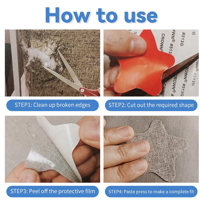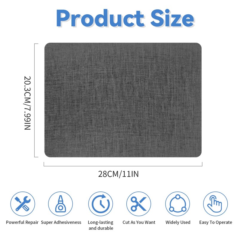 - Es muy fácil de usar, simplemente corta al tamaño o forma deseado, retira el papel protector en la parte posterior y pega la parte delantera a la superficie dañada del sofá. Solo toma unos minutos para una fijación rápida, no requiere pegamento adicional ni herramientas de costura