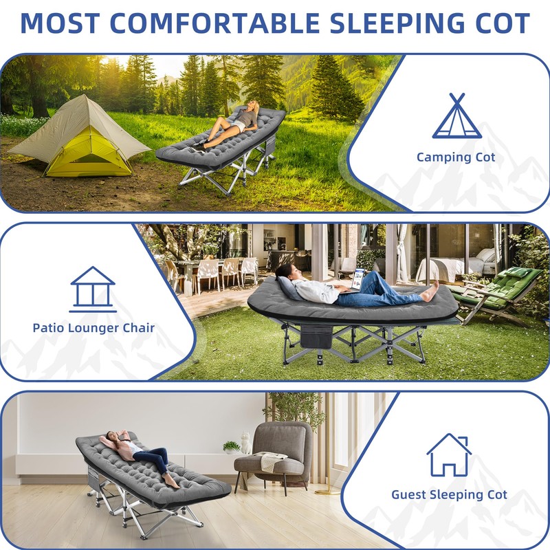 - 【Camping Cot with Mattress for Adults】3-inch ultra-thick mattress and skin-friendly velvet cover to support maximum comfort. The cot mattress has elastic corners on the bottom and a wrap-around top that help keep it in place. NOTE: The mattress comes in a vacuum-sealed bag, please knead the mattress repeatedly and leave it for several hours to fluff it up.
