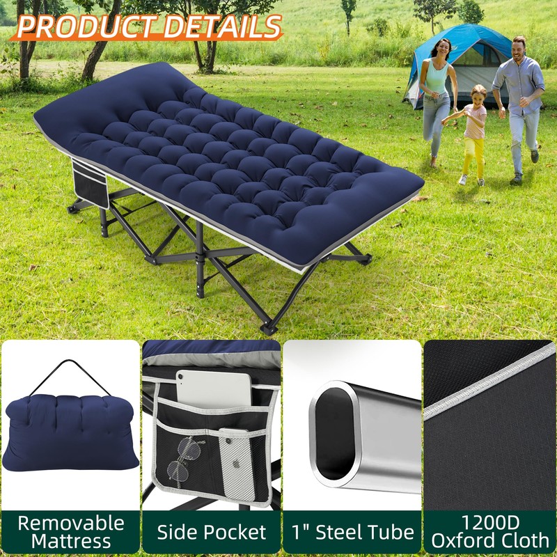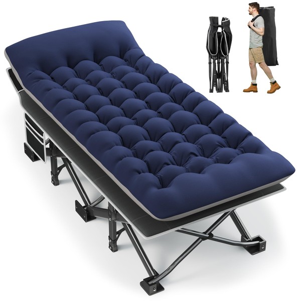 Fragess Portable Camping Cot, 32" Extra Wide Camping Bed with Thick Mattress, Heavy Duty Sleeping Cot Holds Up to 600LBS, Cot for Camping, Rv Trips, Beach, Patio, Office Naps(Blue)