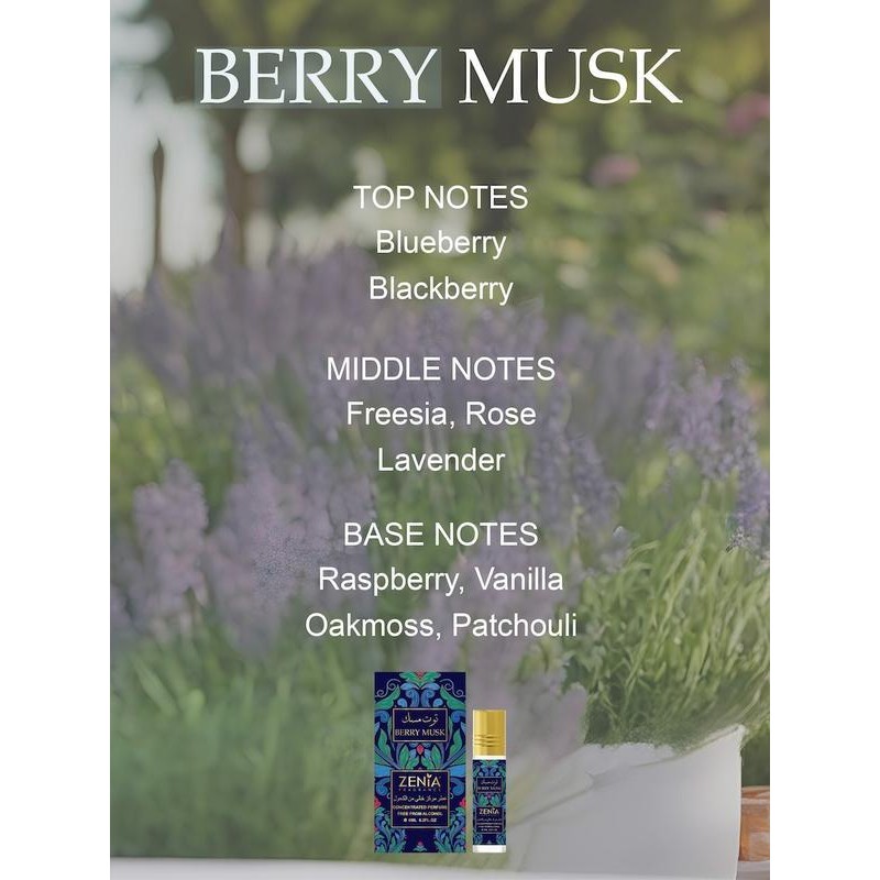 - Mashriq - 6ml (.2 oz) Perfume Oil Roll-On by ZENIA • Top Notes: The scent opens with the bold warmth of Cinnamon and Nutmeg, brightened by a touch of Bergamot, creating a spicy-citrus spark that feels both inviting and refined. • Middle Notes: At its heart, Dates and Praline blend with the floral richness of Tuberose and Mahonial, weaving together sweetness, gourmand warmth, and a touch of elegance. • Base Notes: Finally, the fragrance settles into a deeply layered foundation of Vanilla, Tonka Bean, Amberwood, Myrrh, Benzoin, and Akigalawood—a resinous, woody-sweet trail that lingers beautifully on the skin. Layali - 6ml (.2 oz) Perfume Oil Roll-On by ZENIA • Top Notes: A sparkling burst of Citruses meets the creamy sweetness of Vanilla and Caramel, creating a playful yet indulgent opening. • Middle Notes: The heart unfolds with soft florals—Orchid and Jasmine—woven with the delicate sensuality of White Musk, adding elegance and charm. • Base Notes: Finally, Woody Notes and Vetiver ground the fragrance with an earthy sophistication, balancing sweetness with depth. Zahra - 6ml (.2 oz) Perfume Oil Roll-On by ZENIA • Top Notes: The fragrance opens with the delicate florals of Orchid and Heliotrope, brightened by the juicy freshness of Tangerine, creating a soft yet sparkling introduction. • Middle Notes: At its heart, a delicious Gourmand Accord intertwines with Tropical Fruits, adding a creamy-sweet vibrance that feels indulgent and uplifting. • Base Notes: Finally, the scent settles into a cozy foundation of Vanilla, Musk, and Sandalwood, leaving behind a warm, sensual trail that lingers close to the skin. Zafaan - 6ml (.2 oz) Perfume Oil Roll-On by ZENIA • Top Notes: The fragrance opens with juicy Peach and delicate Apple Blossom, creating a fruity-floral spark that’s vibrant and inviting. • Middle Notes: At its heart, the airy sweetness of Pineapple Blossom adds a tropical brightness, unfolding with playful charm. • Base Notes: Finally, Wild Rose, Musk, and Patchouli create a soft yet grounding finish—floral, musky, and delicately earthy. Berry Musk - 6ml (.2 oz) Perfume Oil Roll-On by ZENIA • Top Notes: Juicy Blueberry and Blackberry open with a burst of sweetness that’s bold, bright, and mouthwatering. • Middle Notes: A delicate bouquet of Freesia, Rose, and Lavender softens the composition, adding floral elegance with a hint of freshness. • Base Notes: Finally, Raspberry, Vanilla, Oakmoss, and Patchouli create a warm yet earthy foundation—fruity, creamy, and grounded in sophistication. Noor Al Haya - 6ml (.2 oz) Perfume Oil Roll-On by ZENIA • Top Notes: Bright Citruses and crisp Bergamot open the scent with a refreshing spark full of energy and light. • Middle Notes: The heart reveals the soft elegance of White Musk paired with the clean, cooling touch of Aloe Vera, adding purity and serenity. • Base Notes: Finally, Jasmine, Musk, Woody Notes, and Oud create a sensual and timeless foundation—floral, musky, and richly layered.