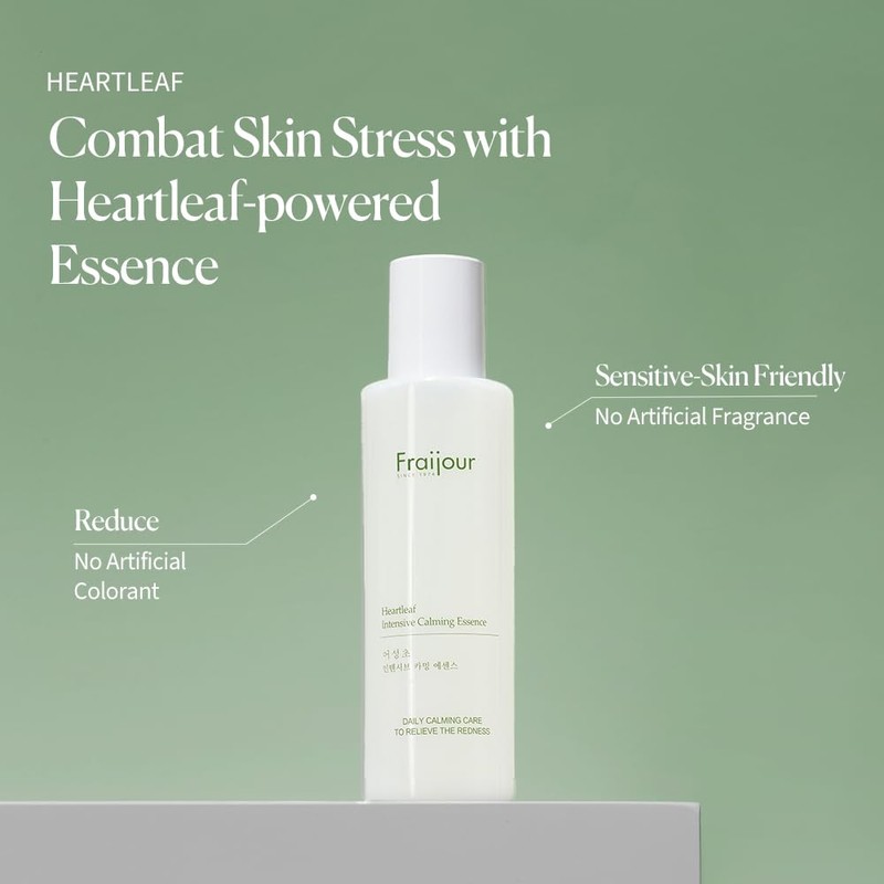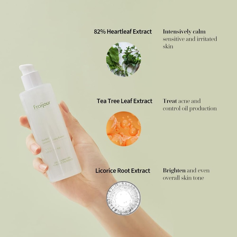 Fraijour's Heartleaf Intensive Calming Essence is a mildly acidic serum containing 82% Heartleaf extract that effectively soothes extremely sensitive skin.