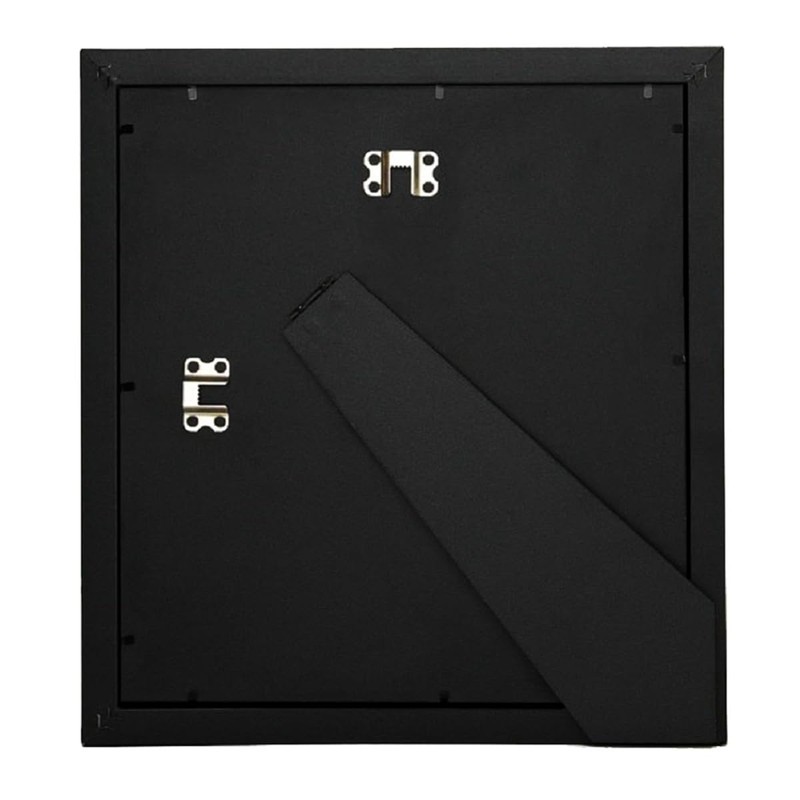 - CONTENTS: 1 Frame. Fits 11x12 inch Pictures, displays 10.5x11.5. Black Color, Wood MDF Material. Plexiglass Front Face (NOT GLASS). Back easel for placing on a table or flat surface, and back hooks for hanging on a wall