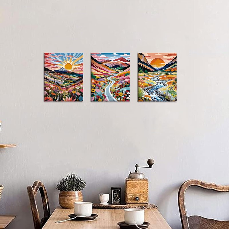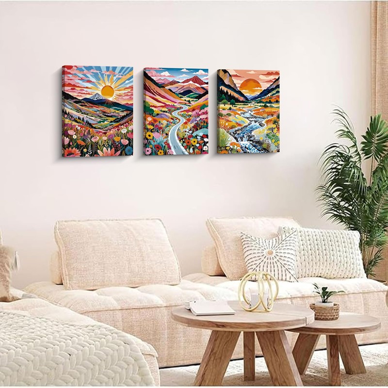 - Bohemian Abstract Artistry: Three cohesive prints feature bold, colorful depictions of mountain landscapes, wildflower fields, and sunset vistas. Flowing lines and dreamy hues capture a free-spirited, nature-inspired vibe, adding artistic depth to your decor