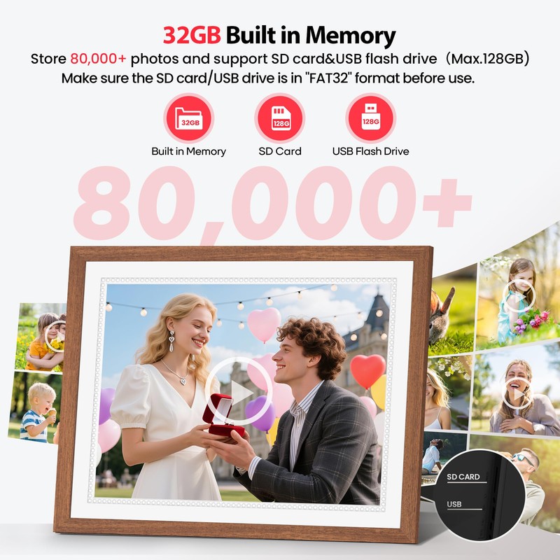 - 【32GB Built-in Storage & Supports SD Card/USB Drive】With built in 32GB memory, our 15” large digital frame can holds 80,000+ photos and supports SD cards and USB Drive for easy transfers and backups. Invite family to share photos remotely via Frameo app—perfect for curating personalized albums and keeping every cherished moment forever! Supports direct playback and file management (import/export/backup) via SD card or USB drive. Note: make sure 64GB and 128GB SD cards must be formatted in FAT32 before use.(Back up your data before formatting.)