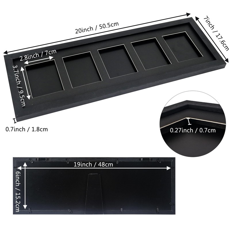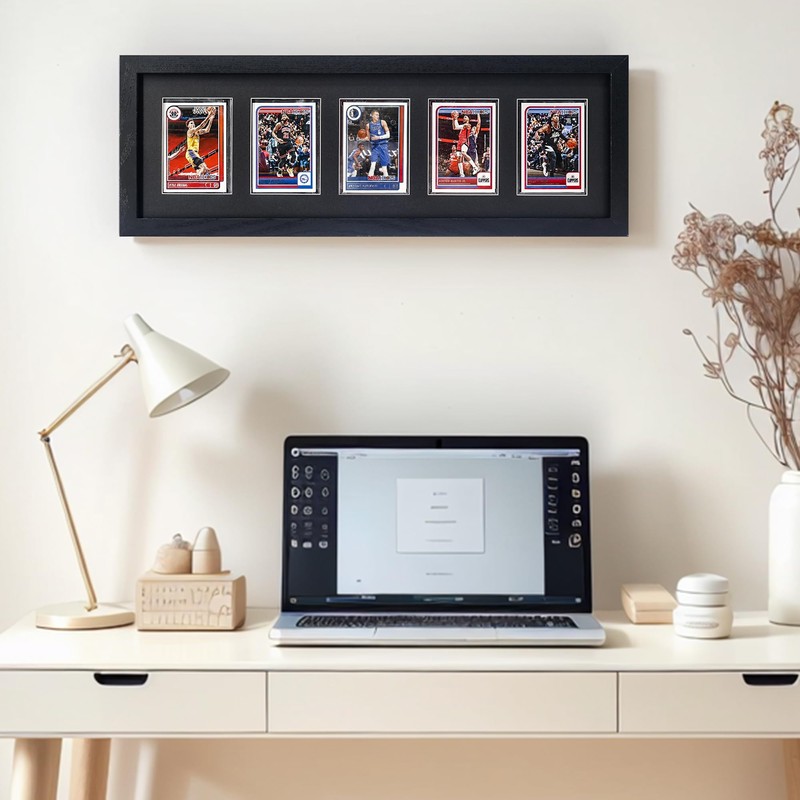- 【Dimensions】The frame Overall size is 20"x7" x0.7" and the interior depth is 0.27 inches. The glass open window for each slot is 2.8x3.7". Can hold 5 pieces standard cards with our card holders.